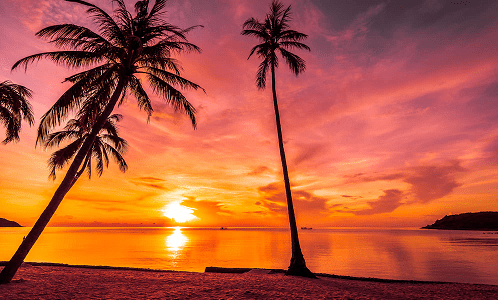 The scent of coconuts waft on the breeze,